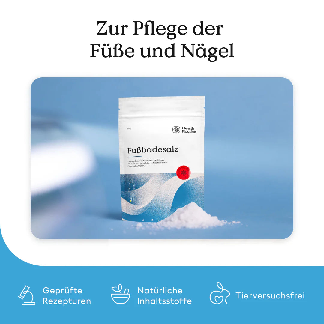 Geben Sie 2-3 Esslöffel Fußbadezalz in 3-4 Liter warmes Wasser (zum Beispiel in eine Schüssel oder eine Fussbadewanne).